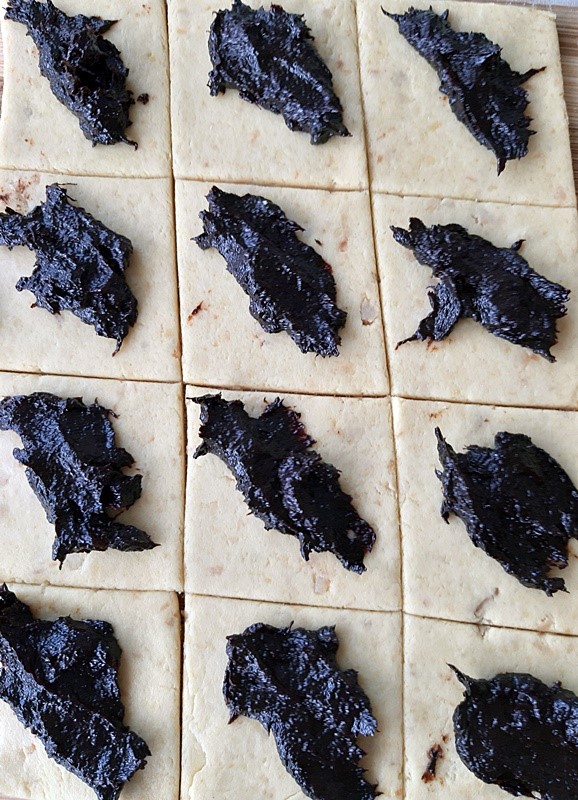 A száraz hozzávalókat jól elkeverem, hozzáöntöm a vajat, tojás sárgáját, majd a vízzel jó rugalmas tésztává gyúrom. Két darabra osztom, egyenként tenyérnyi téglalappá formázom, majd egy enyhén lisztezett tálcára teszem, és folpackkal letakarva a hűtőben pihentetem legalább fél órát. A sütőt alsó-felső sütés 180 fokra bekapcsolom.